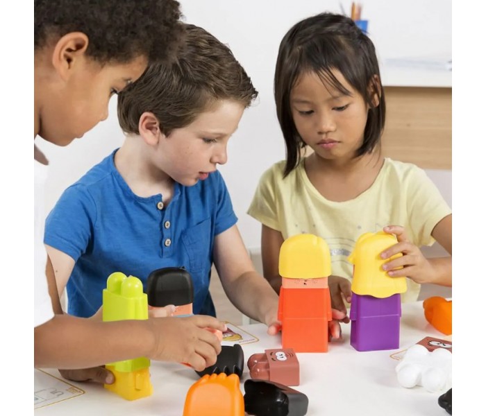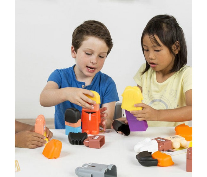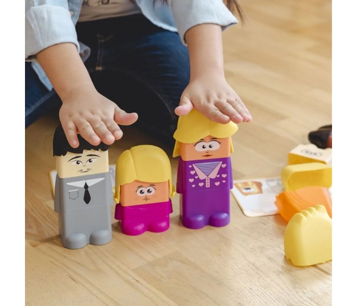 Através da construção e manipulação de blocos, as crianças podem criar múltiplas combinações de famílias, misturando cabelos, rostos, corpos e até um animal de estimação!