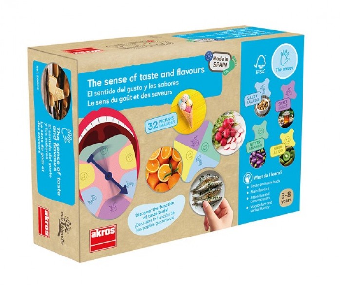 O jogo é composto por 32 cartas circulares com fotos de alimentos, 8 cartas mestras com os sabores básicos: doce, salgado, amargo e azedo, e uma roleta “boca”.