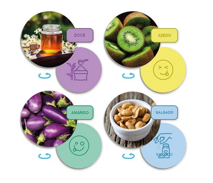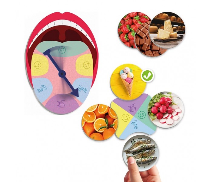 Jogo de associação com imagens reais que permite à criança descobrir os alimentos de acordo com os sabores básicos.
