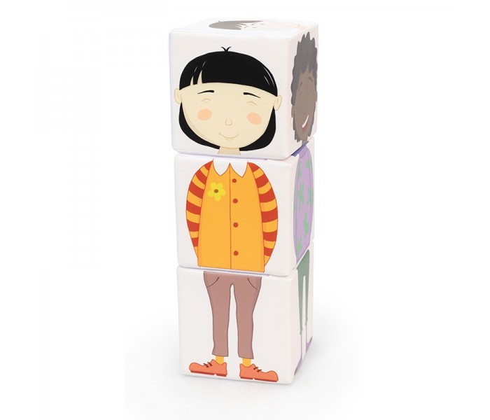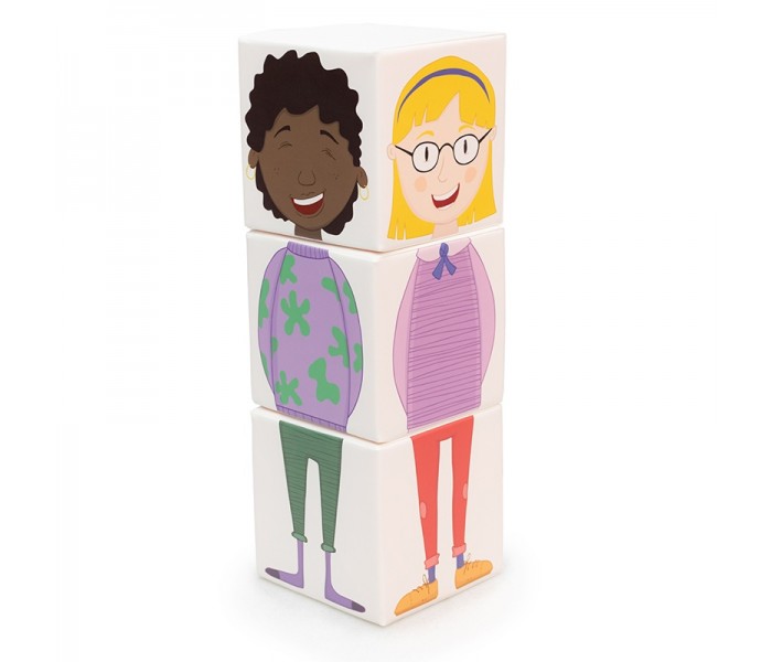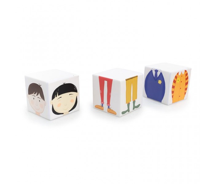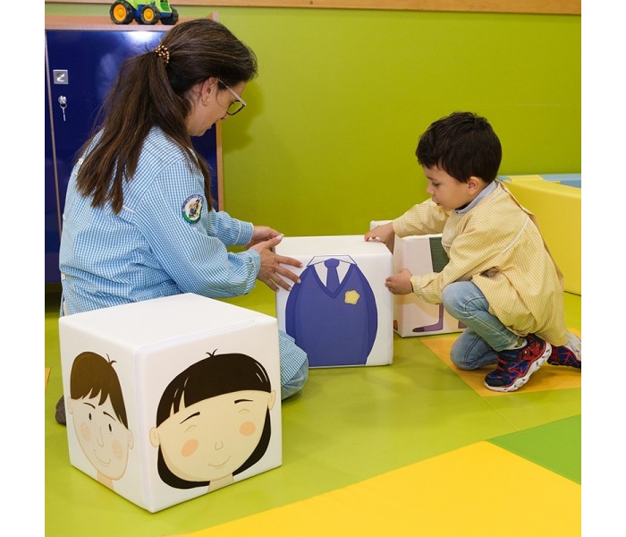 Três cubos com figuras impressas digitalmente em tela lavável e impermeável e interior em espuma.