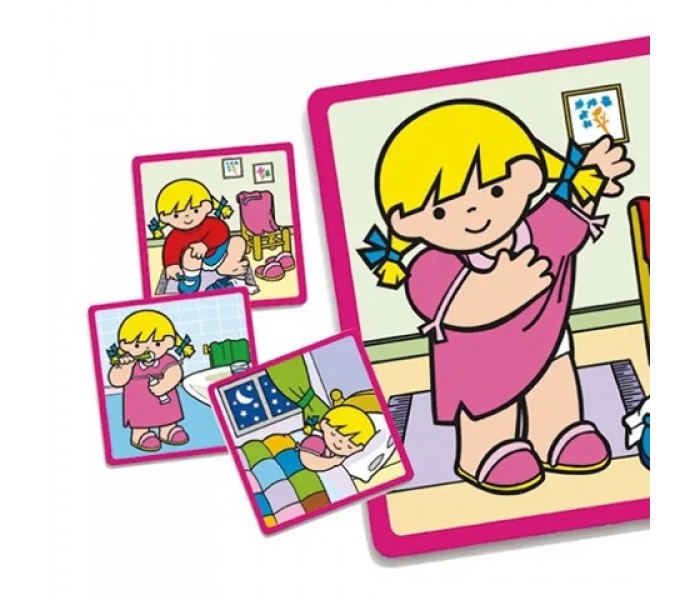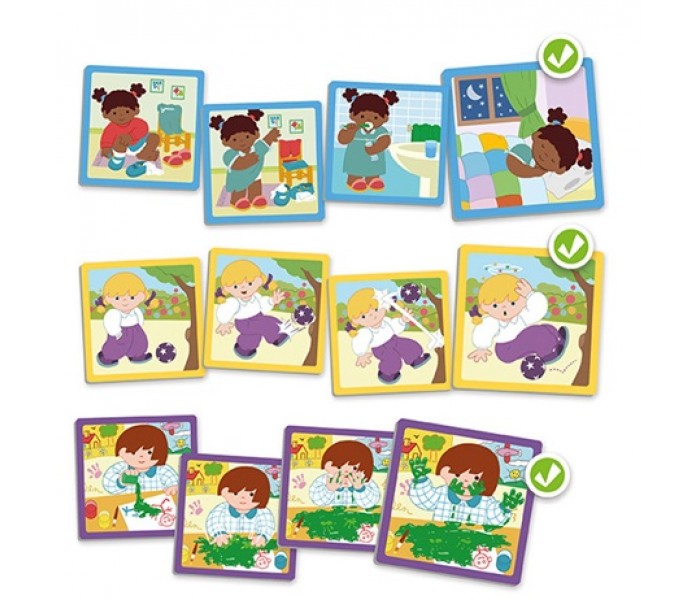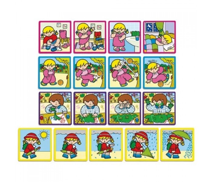 Um jogo de pequenas histórias, em sequência, que visam desenvolver a orientação temporal e a perceção cronológica, para criar pequenas histórias e conhecer as noções temporais.