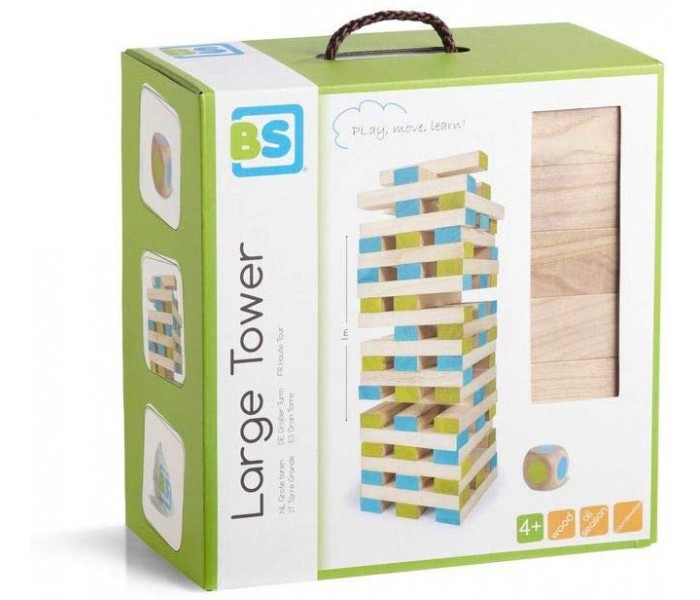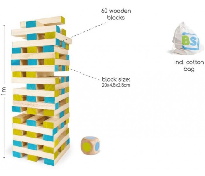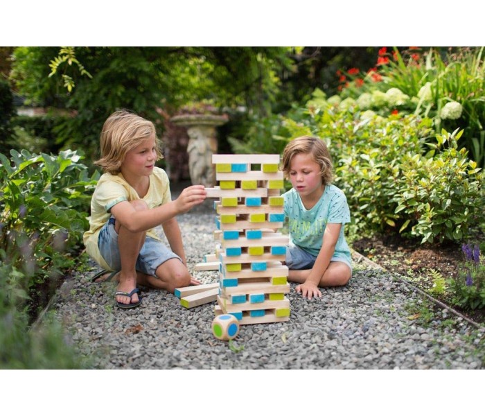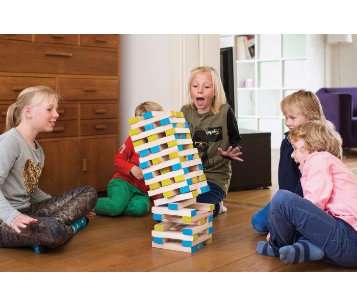 Constroi uma torre alta, tenta recuperar os blocos da tua cor selecionada e coloca-los no topo da torre sem deixar a torre cair. Inclui um dado para definir qual a cor do bloco que deves tirar da torre.
