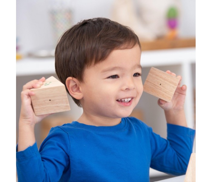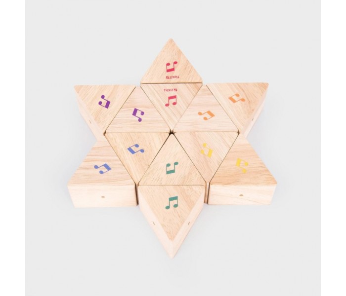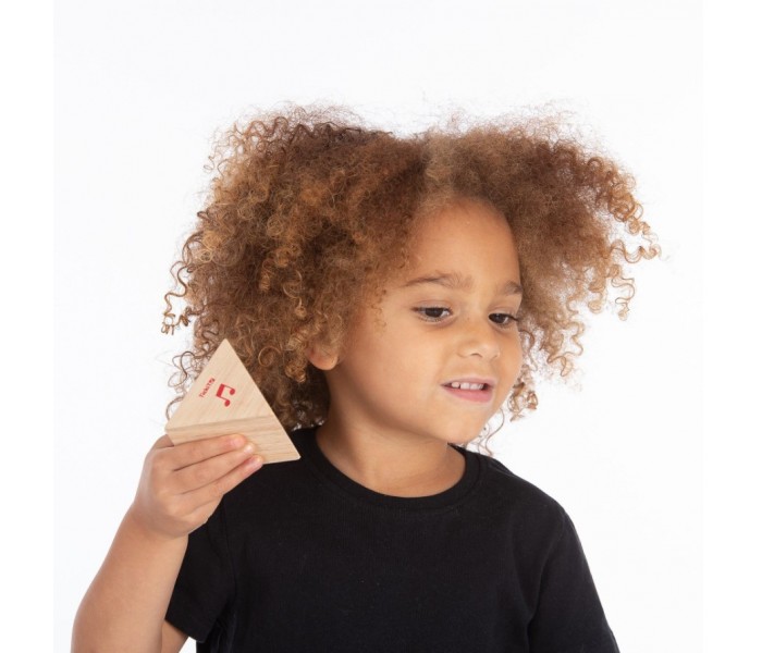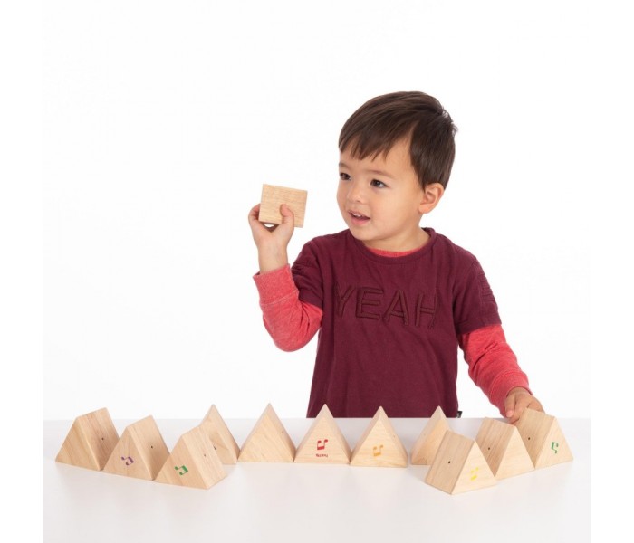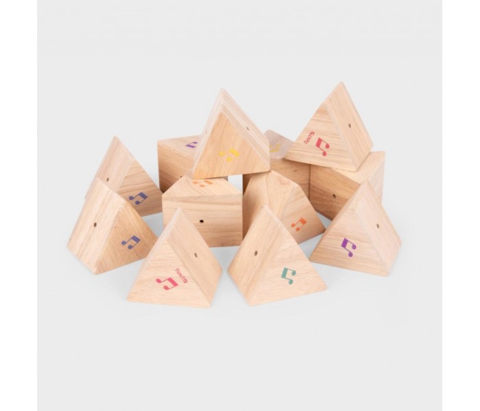 Cada prisma de madeira dura tem um logotipo de nota musical colorida que aparece apenas em uma das extremidades do bloco, permitindo que seja virado para que a criança possa explorar quais blocos produzem sons diferentes e aprender a combinar em pares.