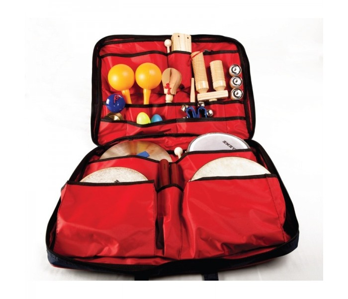 Conjunto de instrumentos musicais de percussão organizados num prático saco, ideal para transporte ou para pendurar, como expositor de arrumação.