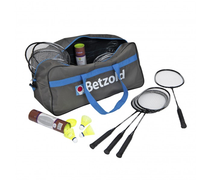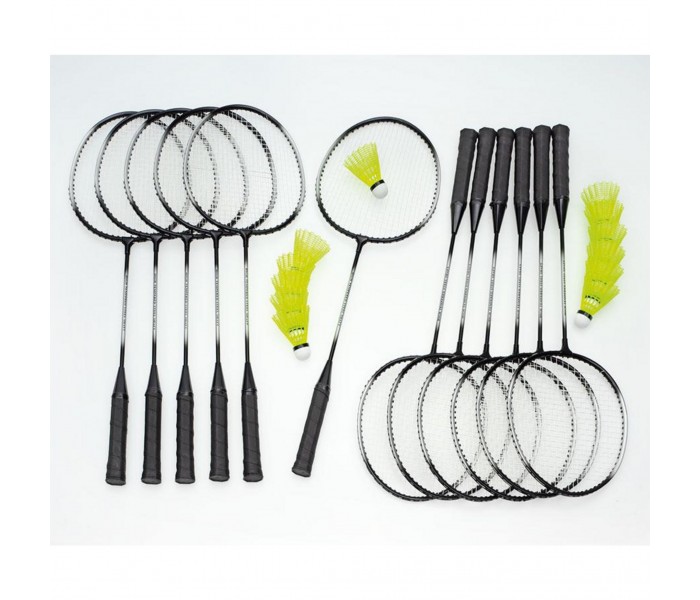 Conjunto de raquetes de badminton composto por 12 raquetes, 12 volantes e saco de transporte.
