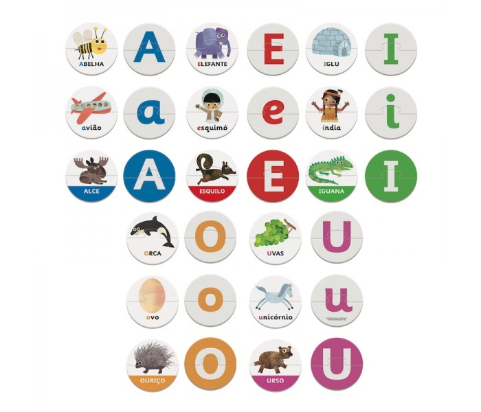 Junta as peças, faz os puzzles circulares, descobre as vogais e reconhece as primeiras palavras!