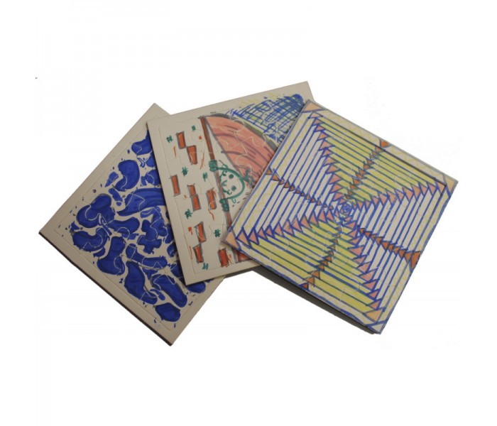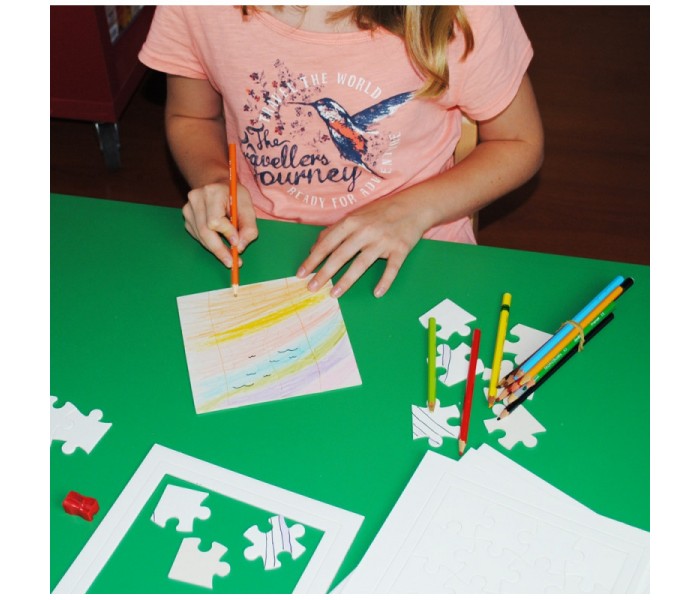 Contém 5 puzzles de 9 peças em branco, feitos de papelão.