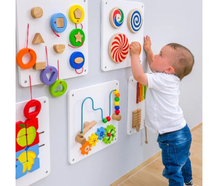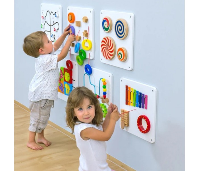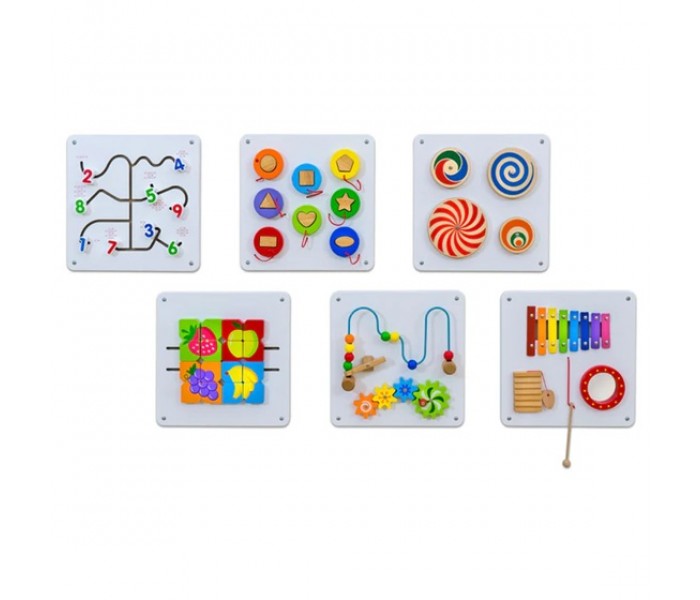 Conjunto de 6 painéis de parede para estimular a motricidade das crianças. Este é o jogo ideal para promover as habilidades motoras dos mais pequenos.