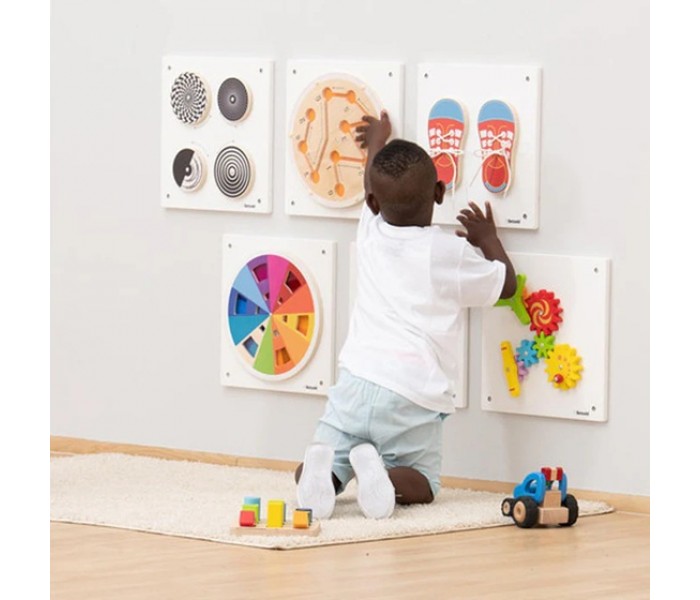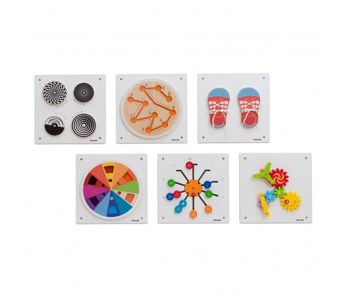 Conjunto de 6 painéis de parede para estimular a motricidade das crianças. Este é o jogo ideal para promover as habilidades motoras dos mais pequenos.