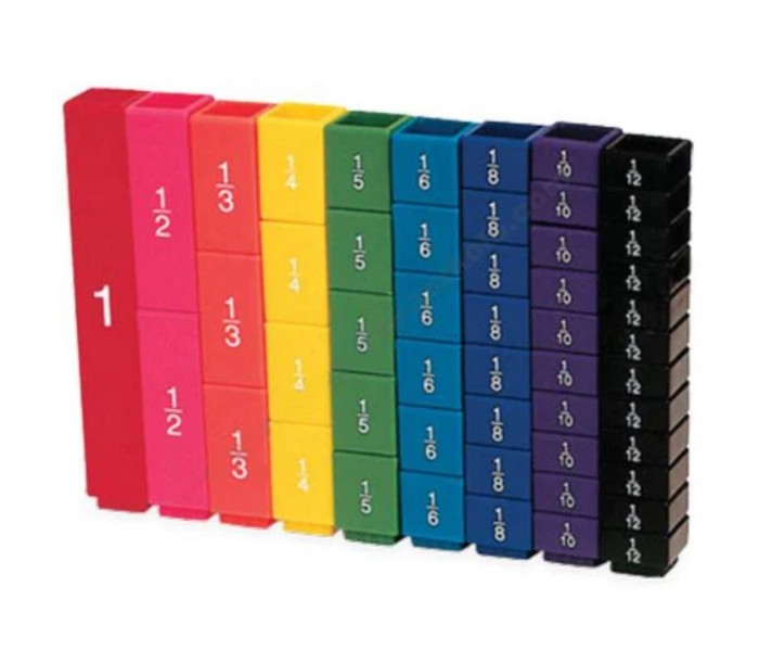 Cada fração é representada por uma cor e pela quantidade de cubos que formam um todo.