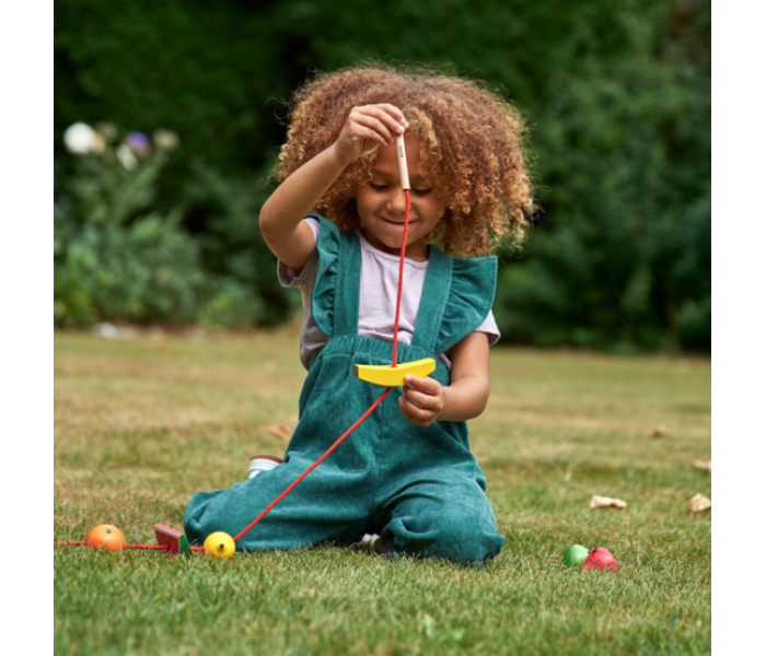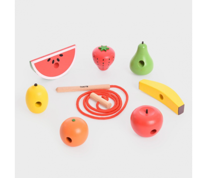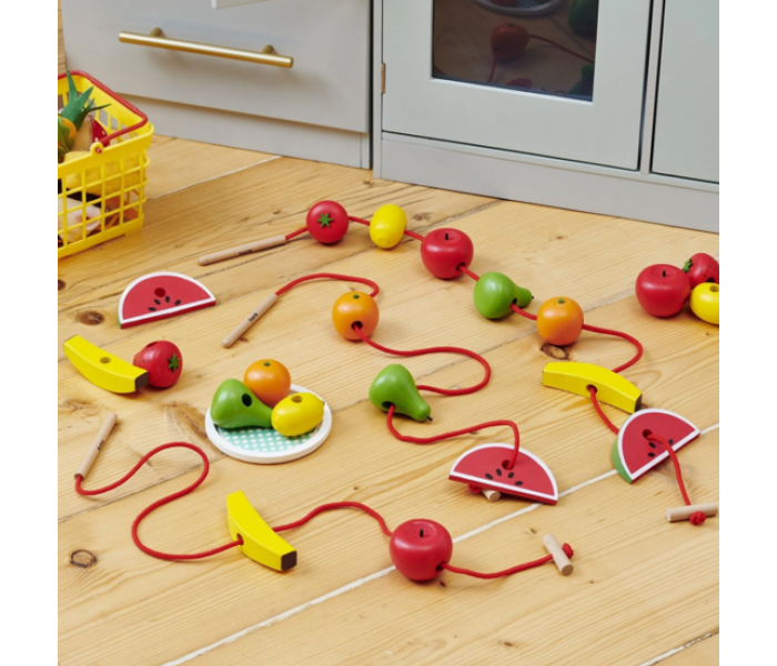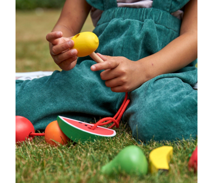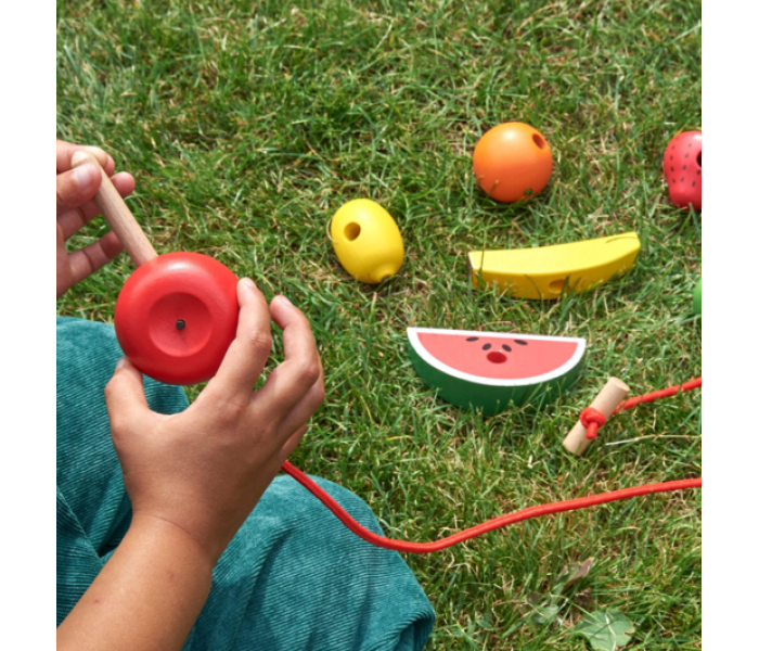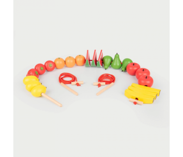 Cada fruta possui orifícios para enfiar e inclui duas cordas com agulhas de madeira e paragens, para que a sua criança possa criar deliciosos "colares" de frutas.