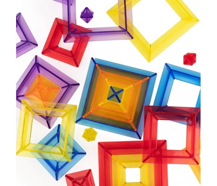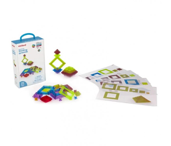 Composto por 25 peças translúcidas, este conjunto permite empilhar, encaixar e construir pirâmides multicoloridas e criativas.