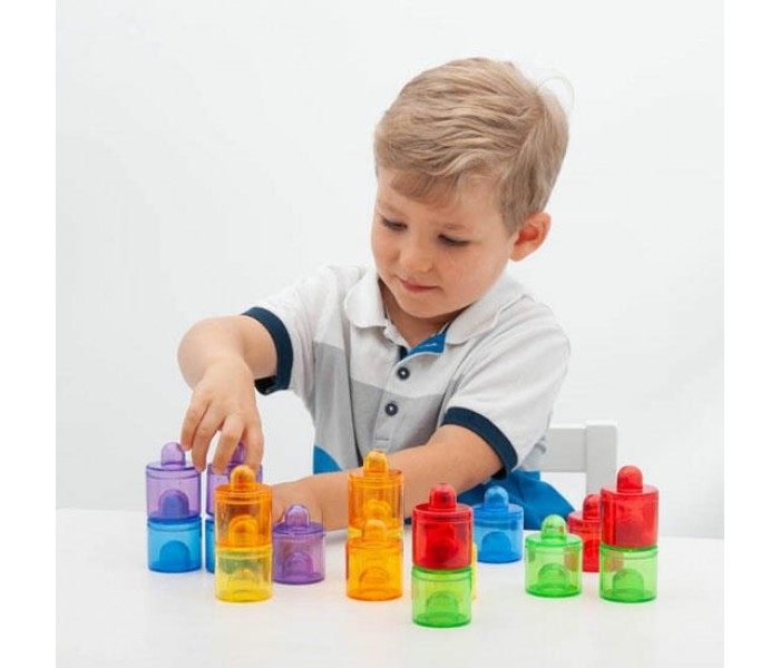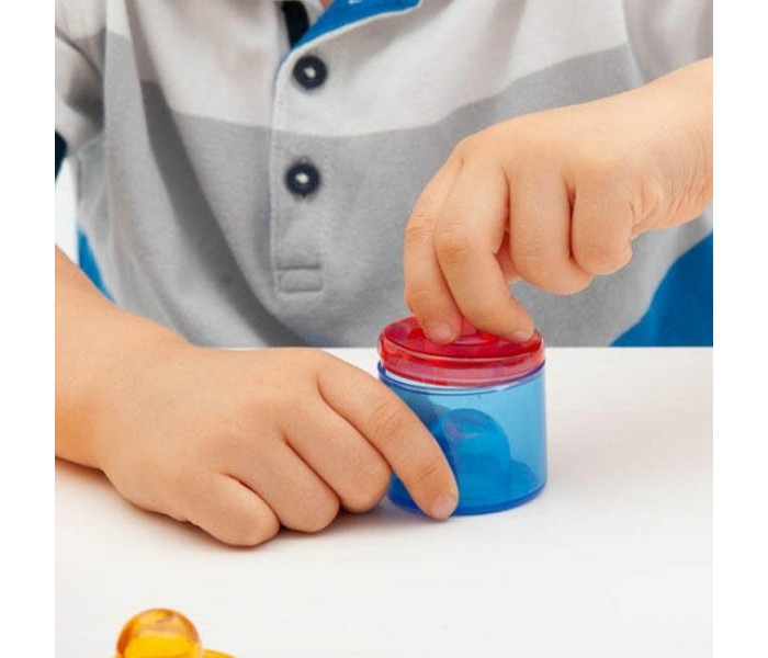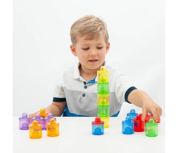 Cada pote tem uma tampa, sendo ideal para enchê-lo com materiais para brincadeiras exploratórias, mistura e combinação de cores, e atividades de empilhamento.