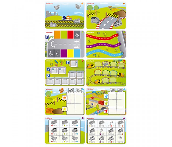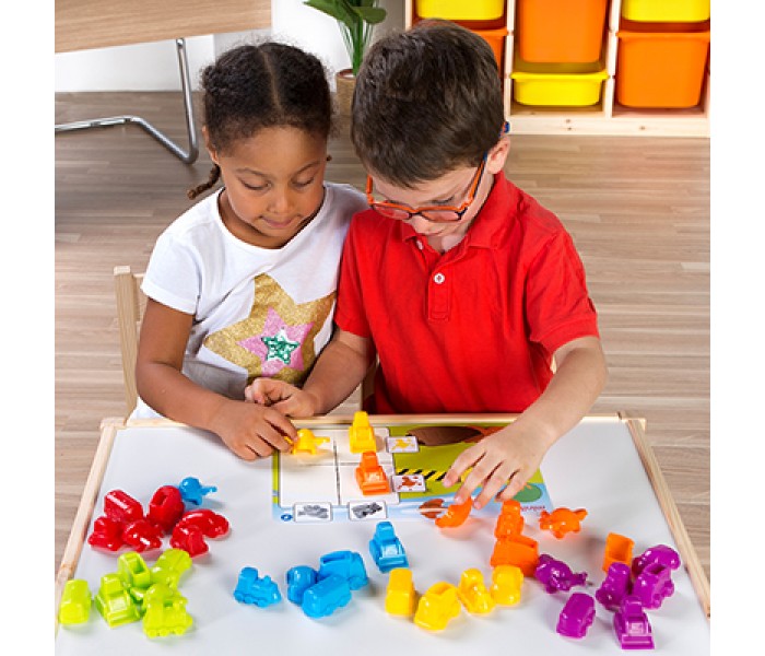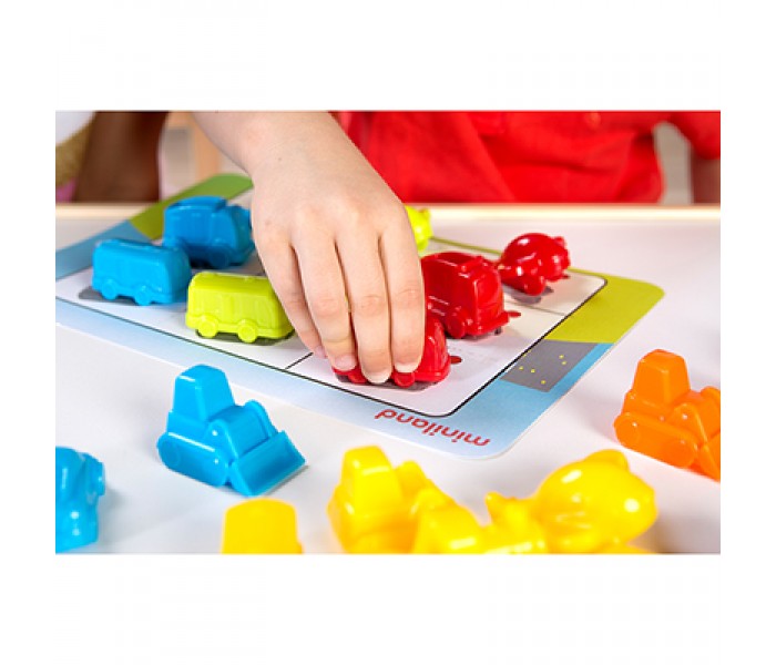 Jogo atraente de veículos, ideal para se familiarizar com a manipulação e o jogo, com as primeiras noções de lógica matemática. 36 veículos de plástico de cores atrativas, acompanhados de uma coleção de cartões ilustrados com um total de 10 atividades com diferentes níveis de dificuldade e 5 temas de jogos diferentes.