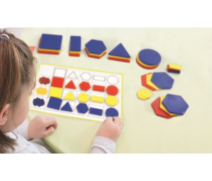 Produzido em plástico resistente, este jogo apresenta 5 formas geométricas básicas: círculo, quadrado, triângulo, retângulo e hexágono, cada um dos quais em 2 tamanhos, 2 espessuras e 3 cores. Eles permitem que as crianças experimentem e descubram formas, tamanhos, cores e padrões, familiarizando-as com o mundo da geometria.