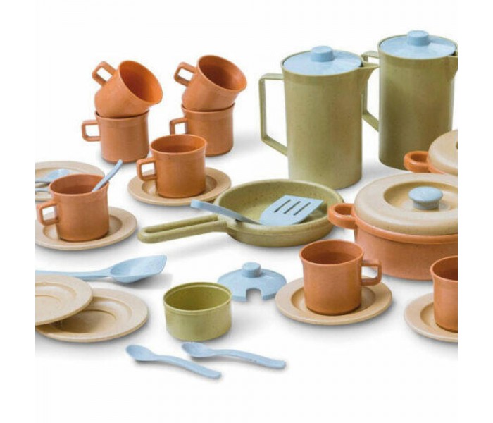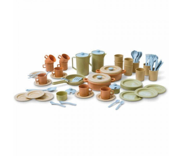 Feito com cana-de-açúcar, 90% de base biológica, 100% reciclável e 100% sustentáveld, este serviço de mesa completo é composto por 79 peças: pratos rasos, pratos fundos, panelas, figideira, copos, tachos, jarros, canecas, garfos, colheres, facas e espátulas.