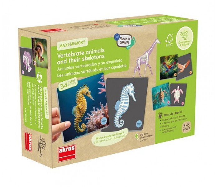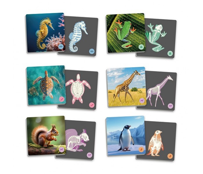 Descubra os animais vertebrados e os seus esqueletos através de um jogo de memória, com grandes cartões com imagens reais.