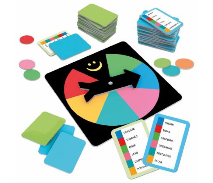Conteúdo: 15 cartas de sujeitos; 15 cartas de ação; 1 roleta, 16 fichas de pontos; Regras