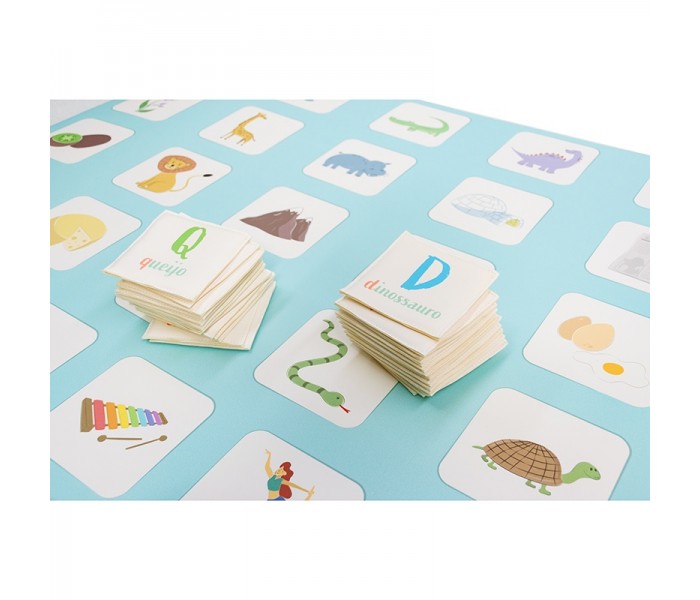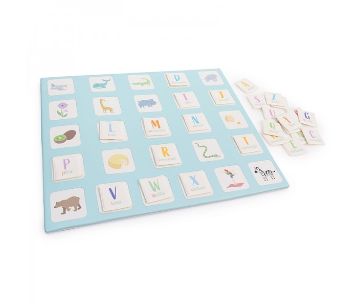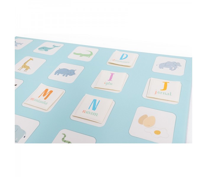 O jogo é composto por 26 peças com letra maiúscula e palavra em letra minúscula para relacionar com a imagem do tapete.