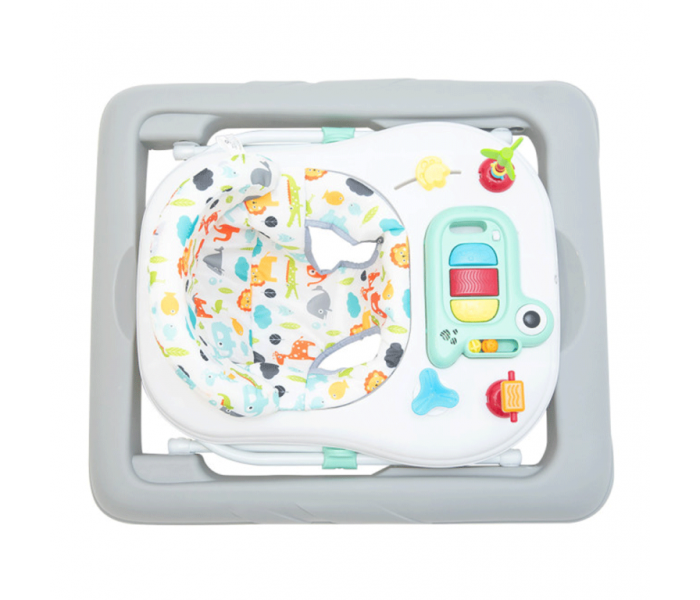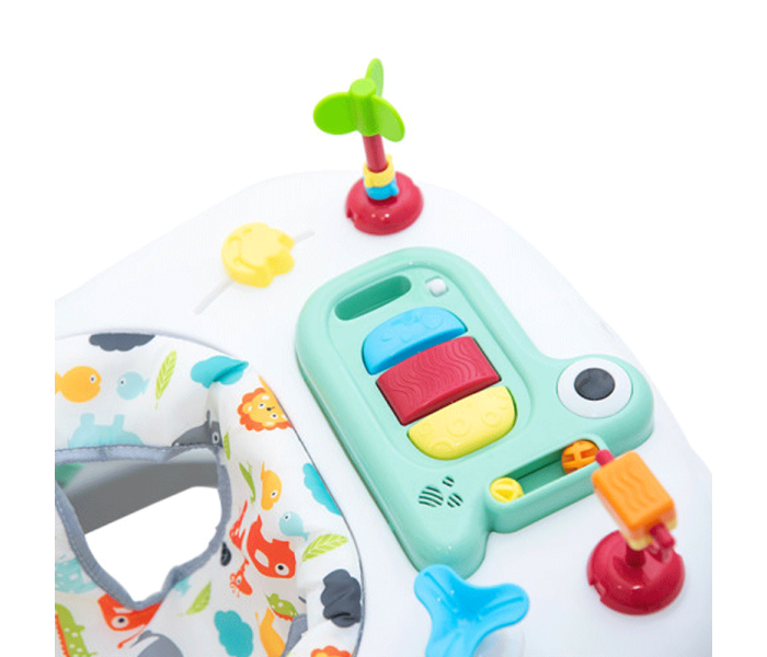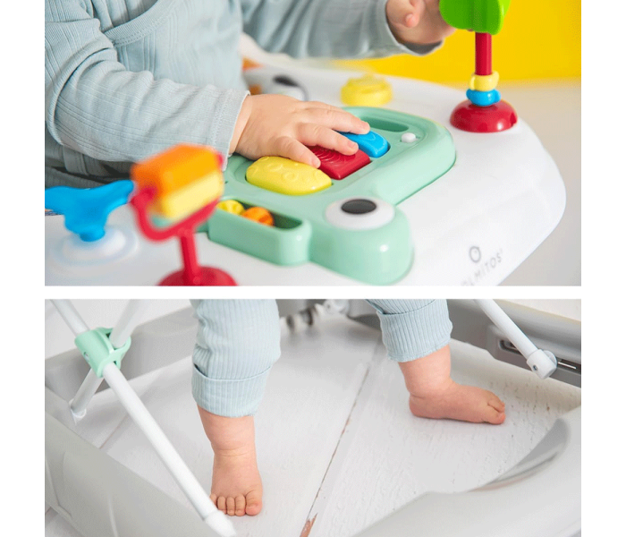 O tabuleiro de atividades integrado oferece uma grande variedade de jogos e estímulos sensoriais para manter o bebé entretido enquanto desenvolve habilidades motoras e cognitivas.