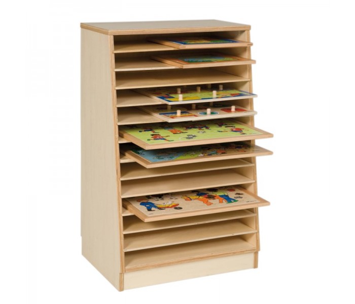O Armário para Puzzles oferece espaço para 14 puzzles de tamanhos variados, até 40 x 40 cm.