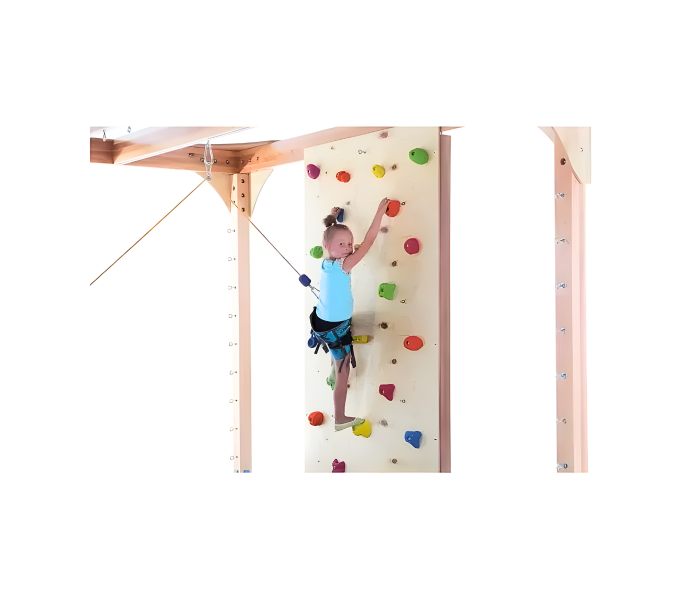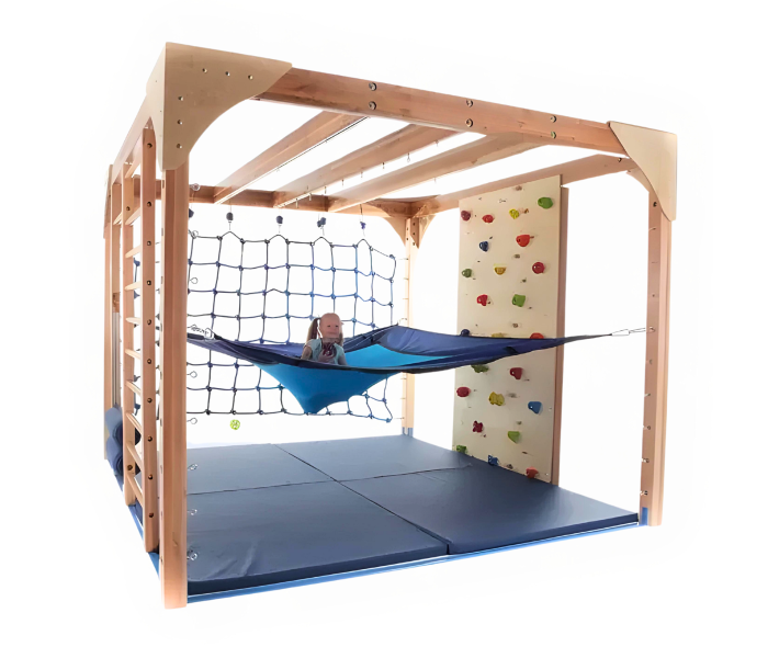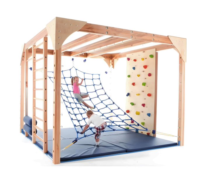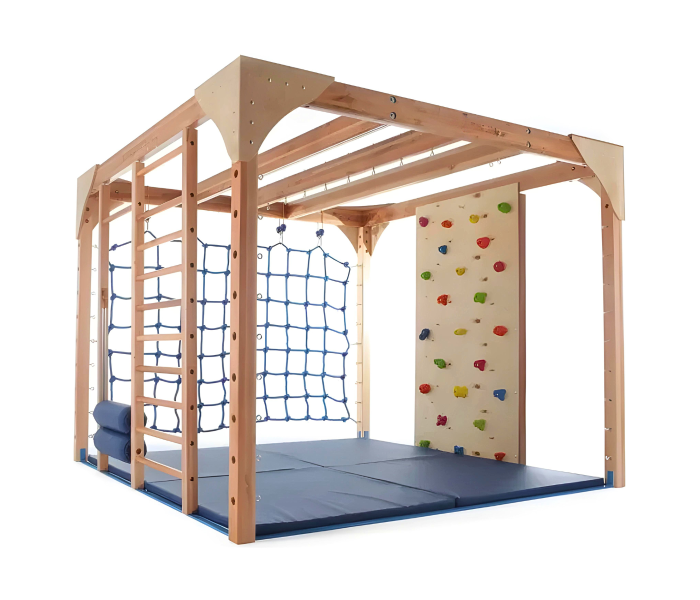 Esta grande estrutura de madeira é chamada de Sistema SENSIS. Muitos dos nossos produtos podem ser fixados nela e removidos novamente para facilitar o máximo de exercícios diferentes possível.