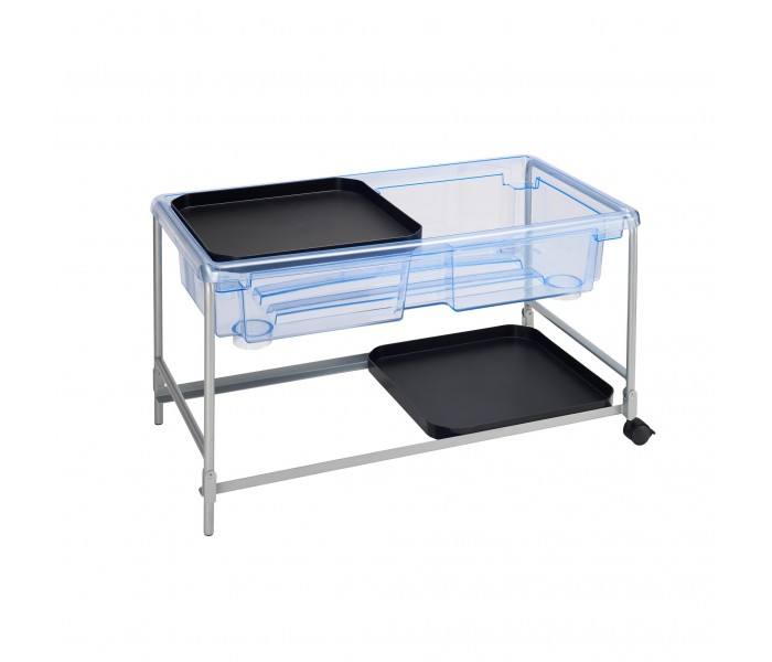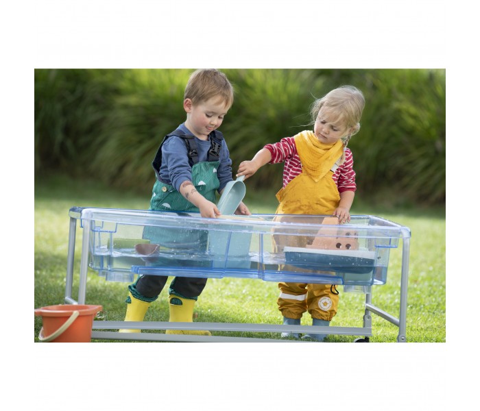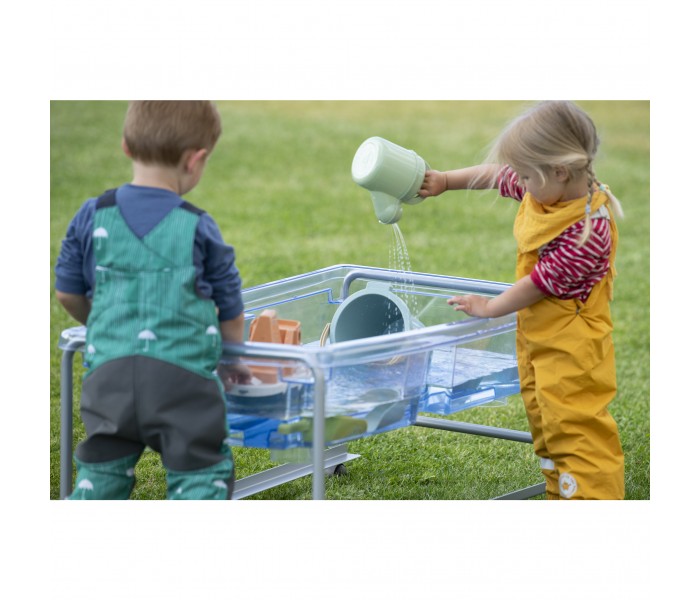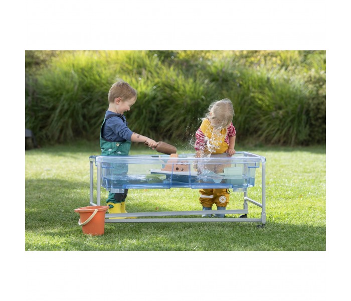 A Mesa de Brincar com Areia e Água transparente com 2 tampas separadas desperta o desejo de observação subaquática em crianças pequenas.