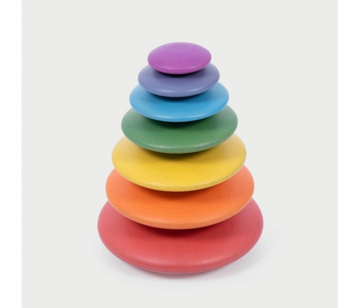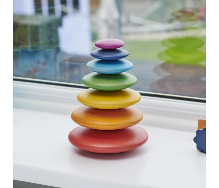 Os Botões de Madeira Arco-Íris são feitos em madeira maciça lisa e suave, com acabamento natural que realça o veio da madeira, nas sete cores do arco-íris. Permitem que a criança crie torres divertidas e instáveis, explorando equilíbrio e criatividade.