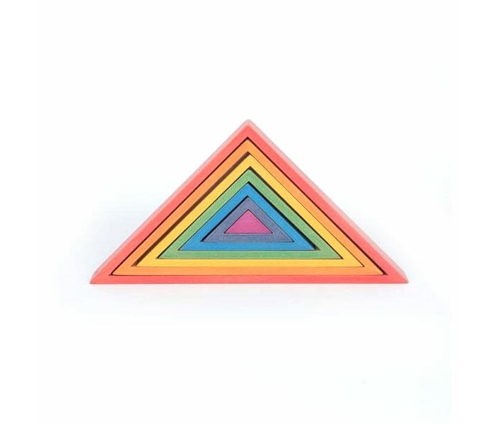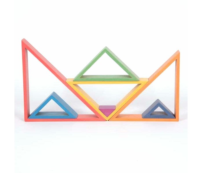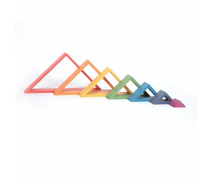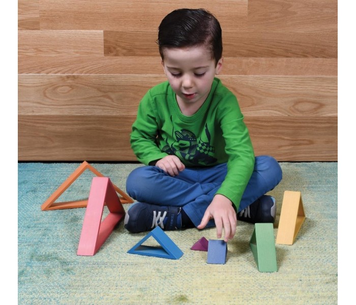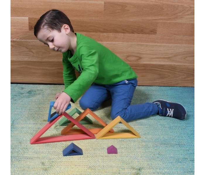 Os Triângulos de Arquiteto Arco-Íris são feitos em madeira maciça de faia, lisa e suave, com acabamento natural que realça a textura da madeira e tingidos nas sete cores do arco-íris. Os triângulos encaixam-se uns nos outros, formando um conjunto cujo bloco central é um triângulo sólido em 3D. Este conjunto permite à criança explorar a criatividade e a imaginação.
