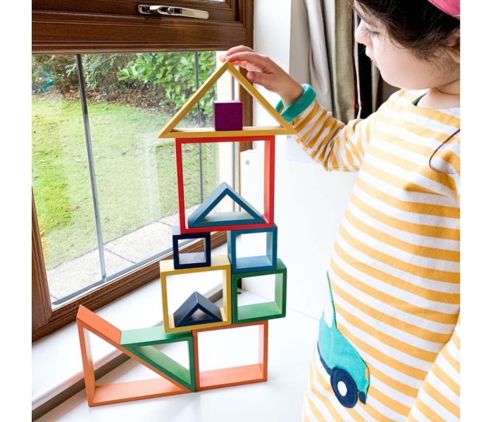Através da brincadeira, o conjunto de peças encaixáveis pode ser usado para construir torres, criar casas para personagens ou animais do jogo simbólico, ao mesmo tempo que desenvolve a lógica matemática para ordenar as formas por cor ou tamanho, aprender as propriedades geométricas dos triângulos, explorar conceitos de escala e tamanho, utilizar linguagem matemática (maior, menor, mais alto, mais largo) e enriquecer o vocabulário descritivo.