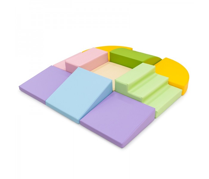 O Percurso Nº 54 é um equipamento lúdico destinado a crianças até aos 3 anos, composto por 9 peças de espuma de poliuretano revestidas com tela PVC impermeável, lavável e com tratamento ignífugo M2, garantindo segurança e higiene.