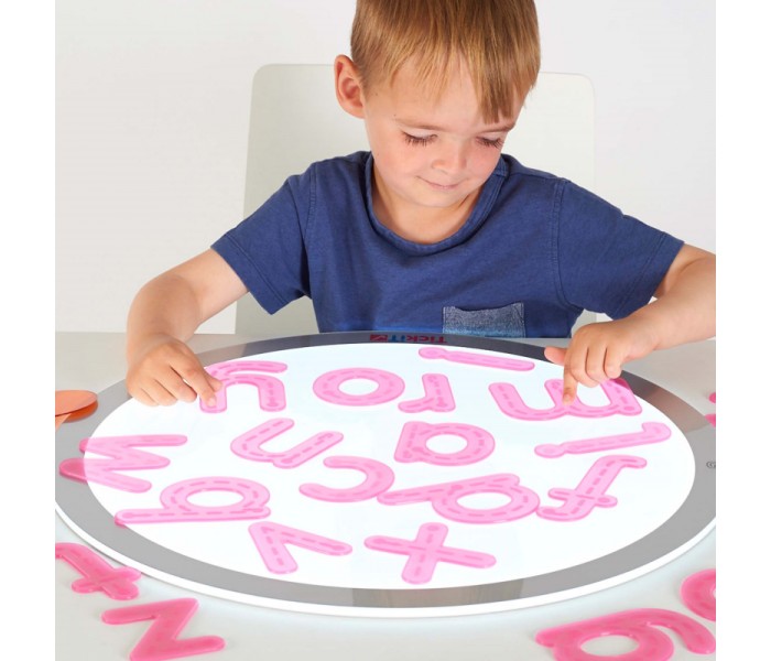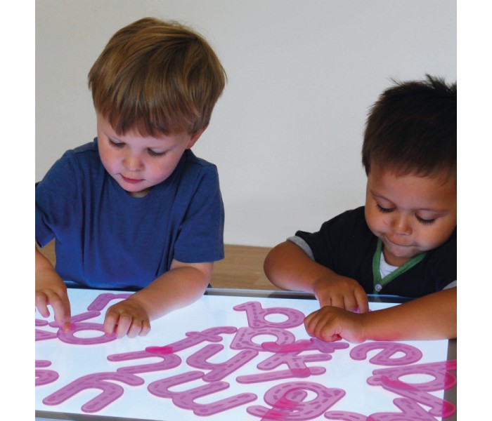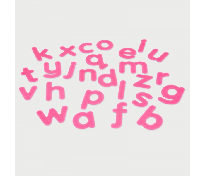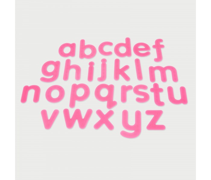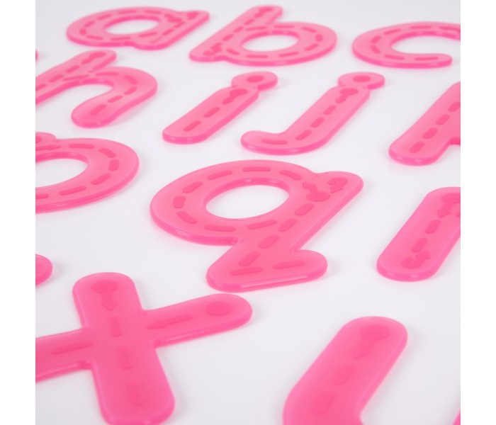 Alfabeto translúcido em silicone rosa, resistentes, macias e maleáveis. Podem ser usadas no dia-a-dia, na caixa de areia, no chão, num painel de luz ou na água. São um excelente recurso para a escolas, creches e/ou escolas primárias, pois contribuem para uma aprendizagem da literacia mais divertida