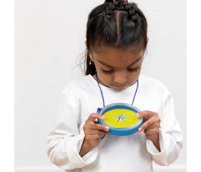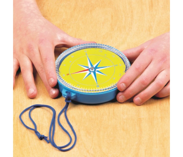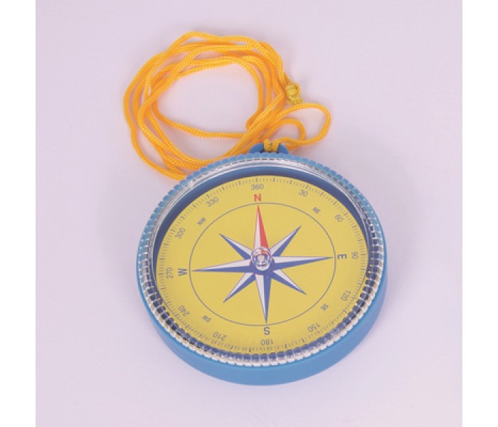 Bússola revestida de plástico resistente com cordão, marcada com 4 pontos de bússola e escala completa de 360 graus em torno de sua borda.