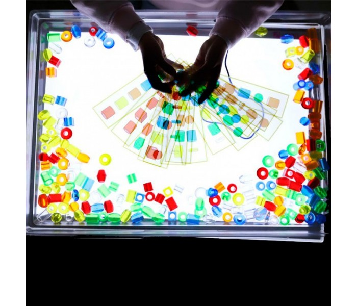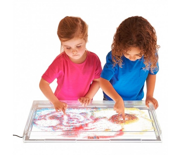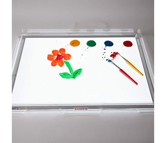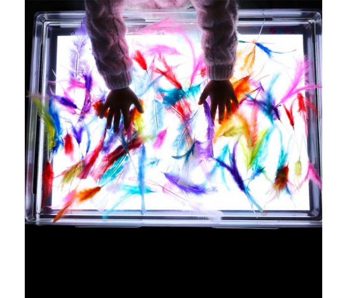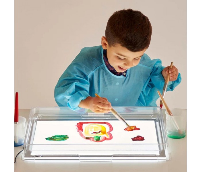 A Bandeja de Exploração de Luz A2 é um recipiente extra grande em policarbonato transparente, projetado para se encaixar perfeitamente com a Mesa de Luz A2, ou como uma bandeja autónoma para uso no chão ou numa mesa. É resistente e robusta, permitindo que o recipiente seja preenchido com água e mantenha a sua rigidez para evitar derrames. Quando usado com a Mesa de Luz A2, é possível iluminar uma variedade de atividades para proporcionar uma experiência sensorial completa às crianças, enquanto exploram diferentes texturas, líquidos e cores. O tamanho interno da bandeja permite acomodar uma folha de papel A3 de forma confortável, permitindo a criação e preservação de obras de arte.