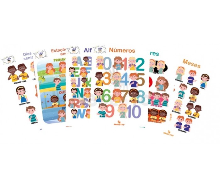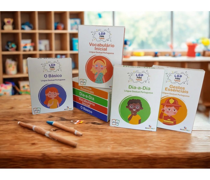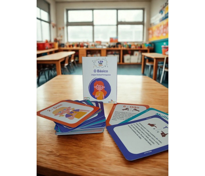 Este pack inclui 200 cartas educativas divididas em 4 conjuntos temáticos (O Básico, Vocabulário Inicial, Dia-a-Dia e Gestos Essenciais), cobrindo alfabeto, números, pronomes, verbos, emoções, estações, cores, saudações e muito mais.