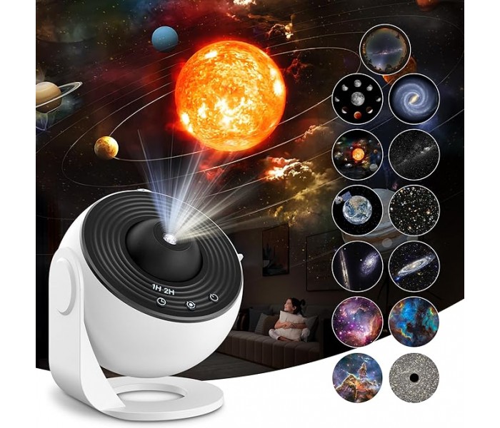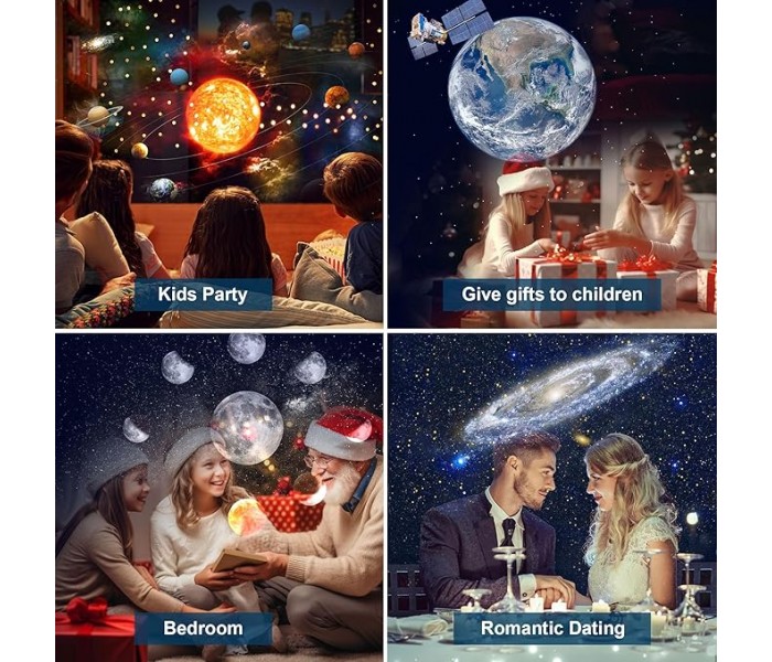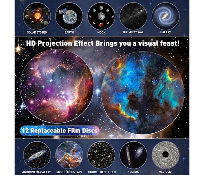 Projetor planetário 13 em 1: este projetor oferece 12 cenas cativantes, incluindo o sistema solar, a terra, a lua, a via láctea, a galáxia, a galáxia de Andromeda, NGC4302-NGC4298, o campo profundo de Hubble, M60--UCDDCDD. 1, a nebulosa da América do Norte, a montanha mística e a pequena nuvem de Magalhães.