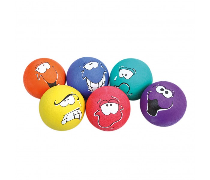 aConjunto de 6 bolas emoções, coloridas, de acordo com a emoção, e com a expressão respetiva.