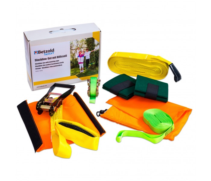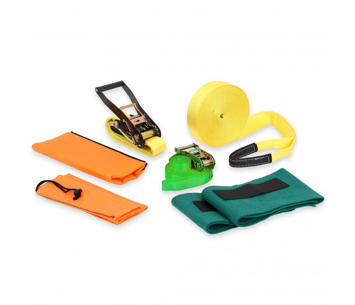 - 1 fita de slackline (comprimento: 15 m; largura: 5 cm; peso máximo: 3000 kg)