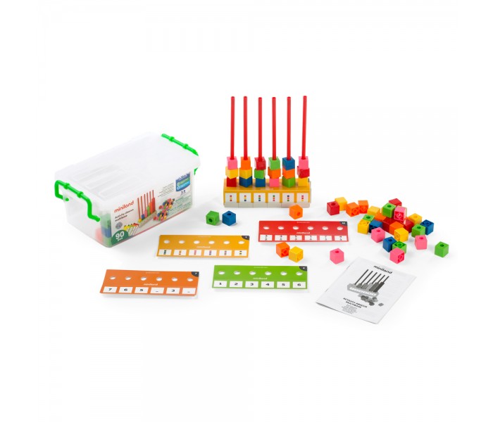 Ábaco vertical de 6 colunas, em plástico resistente, e com cubos em cores atraentes e fáceis de manusear.
