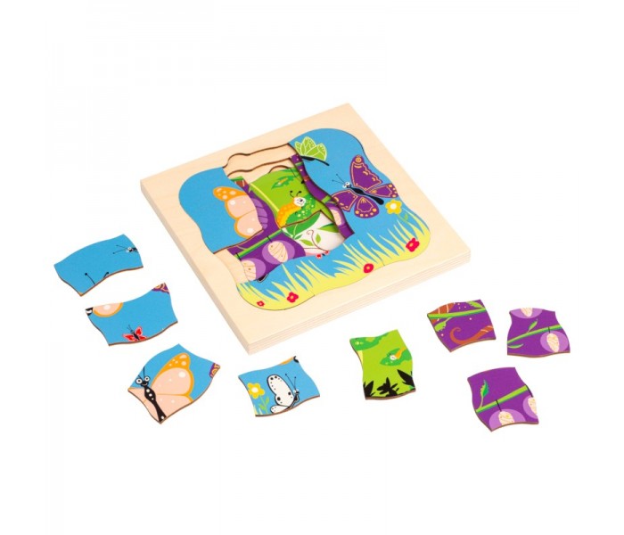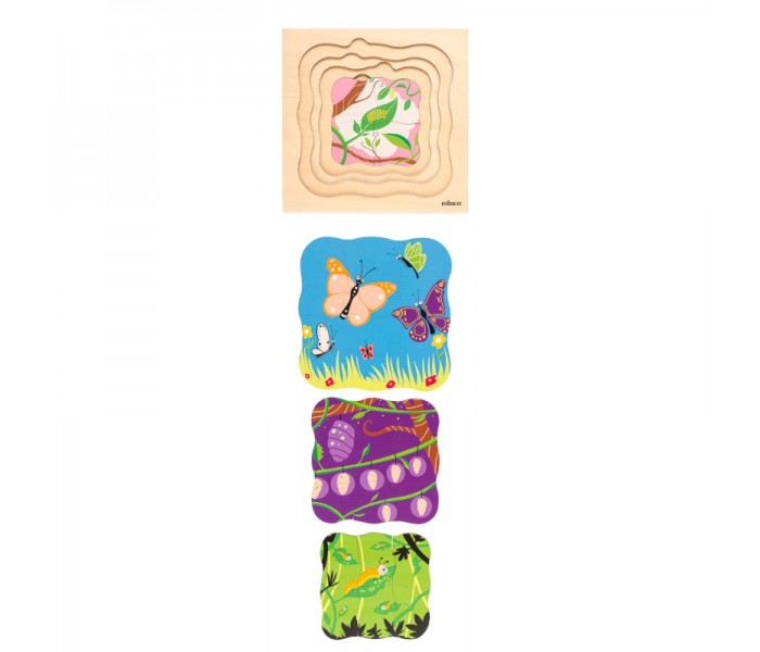 Este puzzle de 4 camadas, com 31 peças, mostra o crescimento da borboleta.