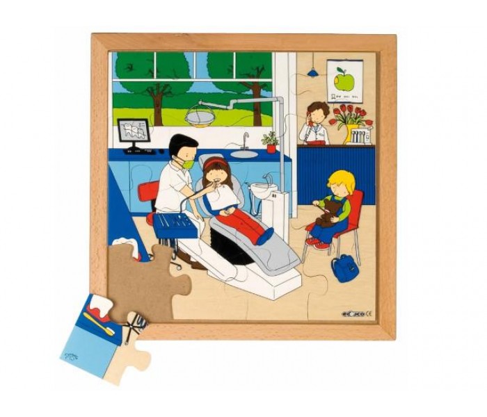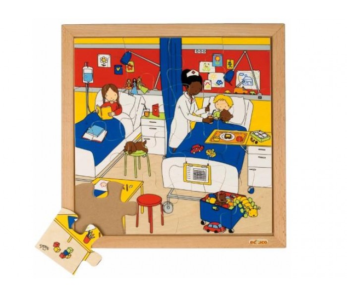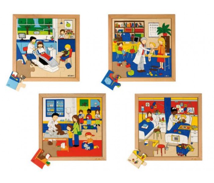 Conjunto de 4 puzzles, com 16 peças cada, sobre os hábitos de saúde: veterinário, médico, hospital e dentista.