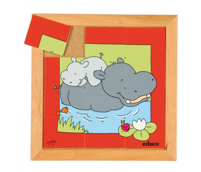 Puzzle de madeira com 12 peças, que mostra a interação entre mães e filhos, nomeadamente, os hipopótamos.