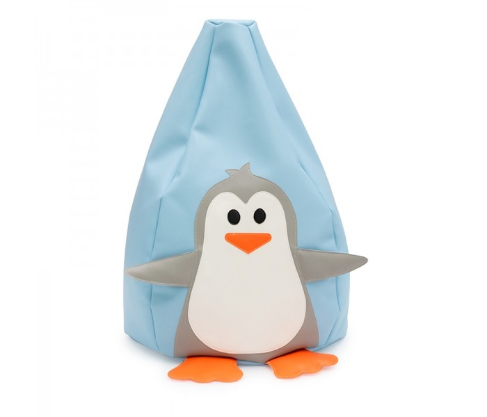 O puff em forma de pera com imagem de um pinguim, ideal para salas de leitura onde as crianças podem estar confortáveis a ler ou a contar histórias aos seus colegas, estimulando a imaginação das crianças.