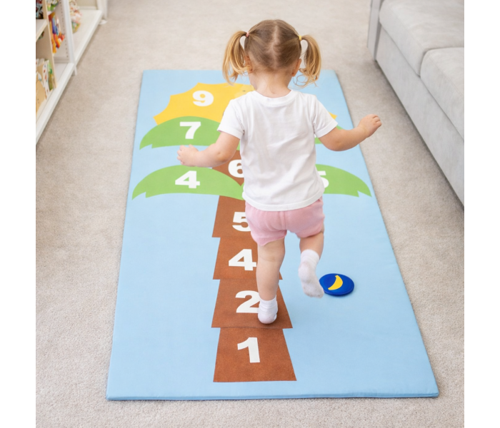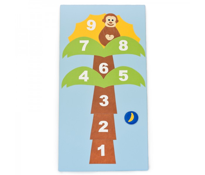 Tapete e malha com figuras costuradas, Jogo da Macaca, em tela lavável e impermeável e interior em espuma de alta densidade. Com fundo antiderrapante.
