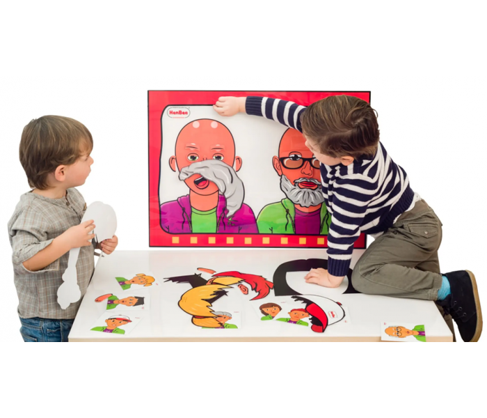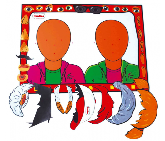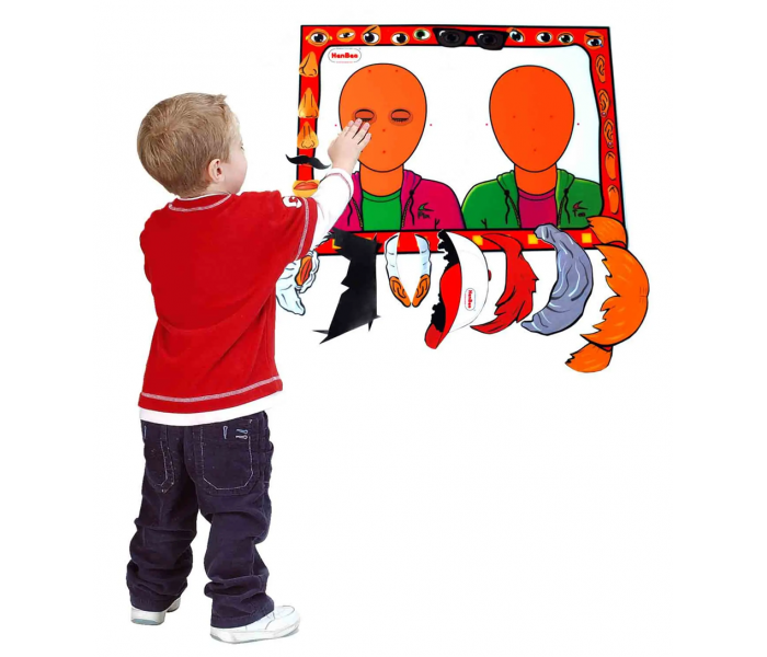Este brinquedo educativo é um kit completo que consiste num painel mural impresso com dois rostos sem traços e mais de 50 peças com velcro.