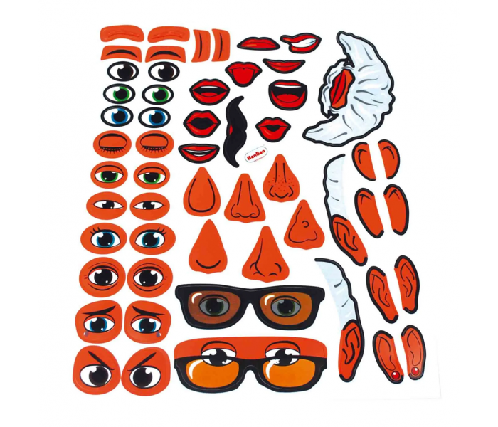 As peças em velcro incluem olhos, cabelo, boca, nariz, bigode, orelhas e óculos.