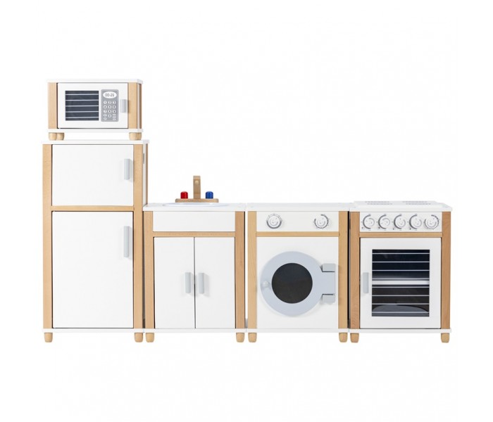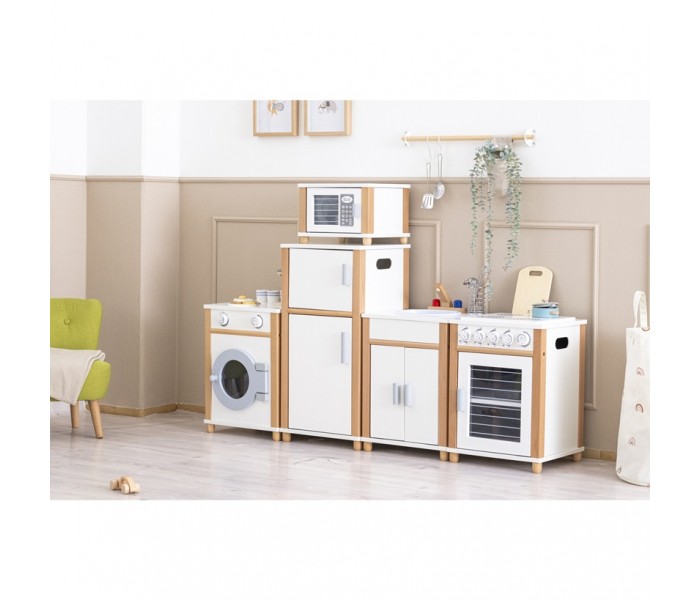 O cenário está equipado com um forno e fogão num módulo, um frigorífico e congelador, um lava-loiça removível e uma máquina de lavar. Os elementos de cozinha de brincar apoiam jogos de papéis divertidos que fortalecem a comunicação e o comportamento social. Quer sozinhos ou em grupo, o mobiliário de brincar proporciona horas de diversão e ensina os mais pequenos ao mesmo tempo o primeiro trabalho de casa.