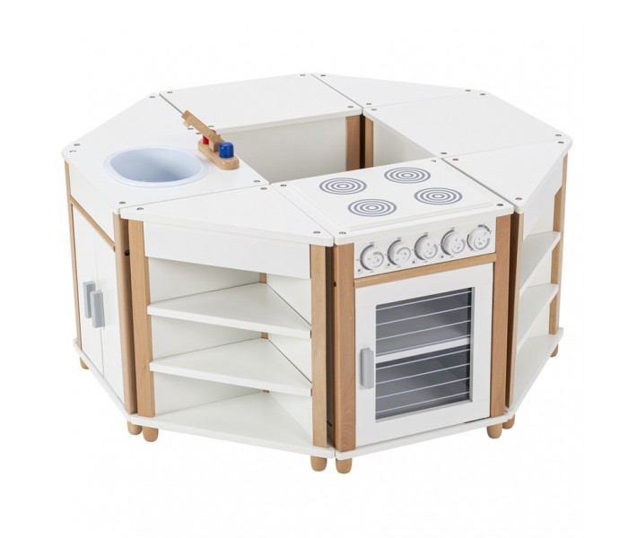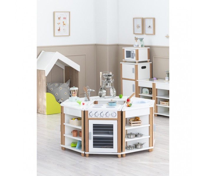 As 4 prateleiras de canto da cozinha não só oferecem muito espaço para pratos de brincar e acessórios, como também podem ser montados para formar uma ilha de cozinha estável. Isto convida-os a cozinhar e a fazer bolos juntos e cria espaço para brincadeiras criativas em grupos. Todos os elementos da ilha de cozinha podem ser facilmente montados e combinados com outros móveis. A ilha de cozinha promove a interação social, a criatividade e o desejo de experimentar coisas de forma lúdica.