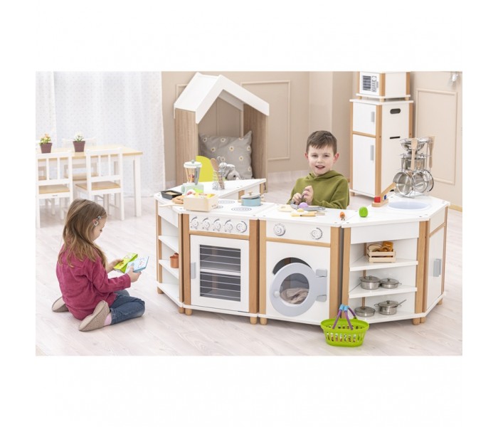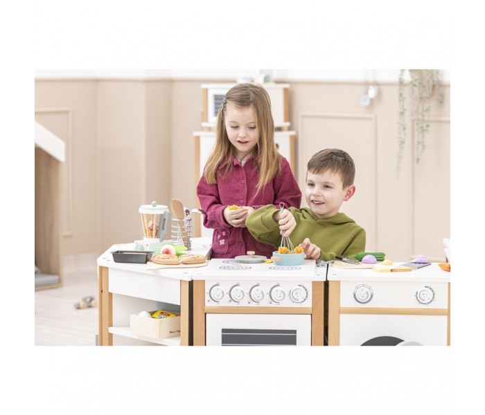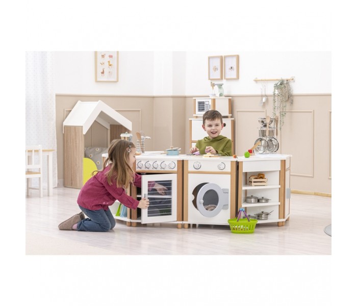 Com esta Ilha de Cozinha, fazer jogos de papéis torna-se uma experiência real. O conjunto é composto por 8 elementos de alta qualidade: fogão com forno, lava-loiça, máquina de lavar loiça, máquina de lavar e 4 prateleiras de canto robustas. Esta combinação ponderada permite às crianças reencenar as ações dos adultos num ambiente seguro e criativo. Quer cozinhe, faça bolos, lave a loiça ou arrume – os jovens chefs podem deixar a imaginação voar e treinar as suas capacidades motoras finas e sociais ao mesmo tempo.
