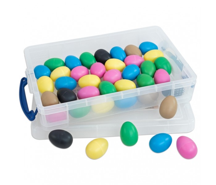 Com estas maracas, constituídas por 40 ovos shaker em 6 cores e timbres deste conjunto, podes equipar um grupo ou sala inteira. As crianças desenvolvem um sentido de ritmo e tato ao abanar os ovos. Podem usá-lo para acompanhar canções conhecidas e explorar o instrumento de forma independente.